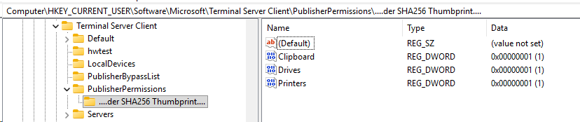 Diesen SHA256 Thumbprint (erweitert um ein „00“ hinten) legen wir als Key dann unter HKCU/Software/Microsoft/Terminal Server Client/PublisherPermissions an.